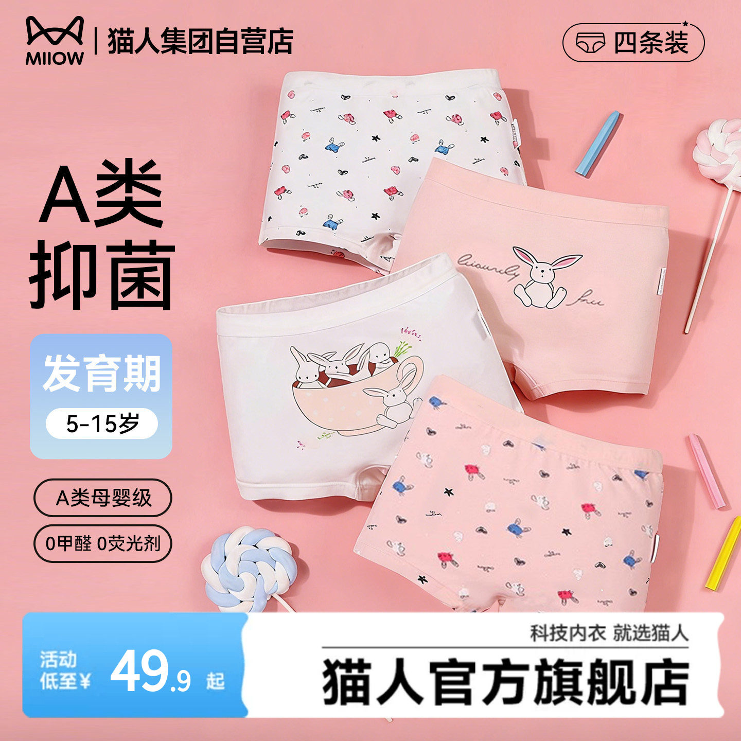 威尔贝鲁女童内裤儿童A类抗菌平角内裤四角女宝中大童不夹屁屁男
