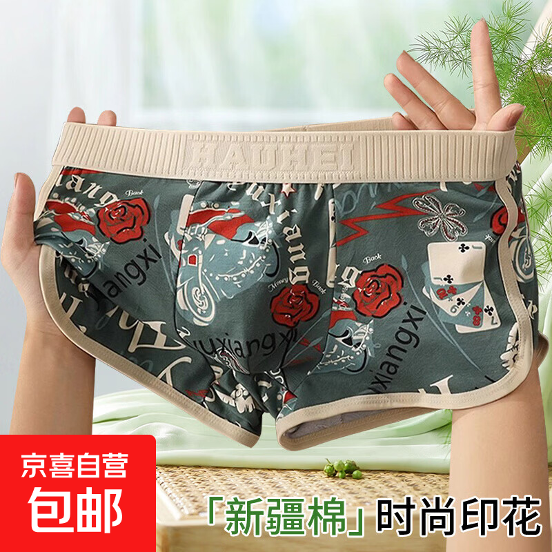 纯棉男士内裤柔软亲肤男生四角裤头时尚印花宽松大码平角裤衩新款 3条-蓝色+绿色+灰色 2XL 140-160斤