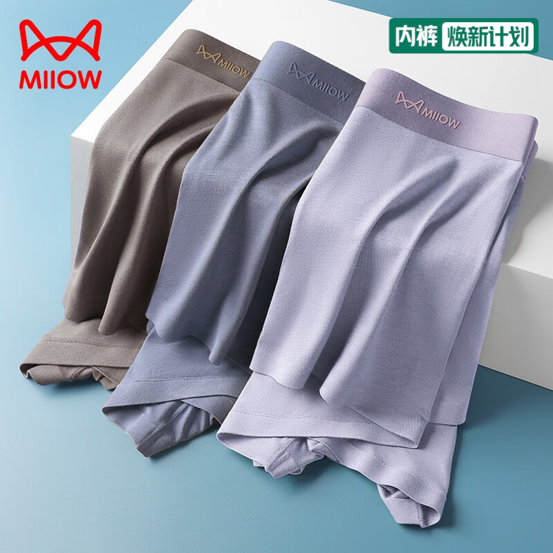 猫人3条装莫代尔男士内裤无痕平角裤中腰透气四角裤u凸短裤头 钴蓝+浅紫+咖啡 3条 2XL (120-140斤)