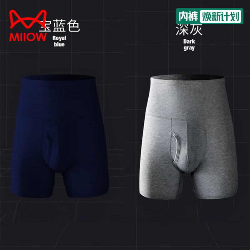 猫人(MiiOW)男士内裤 2条装全棉运动内裤高腰收腹大码加长防磨腿平角裤 宝蓝色+深灰色 2条 3XL (140-160斤)
