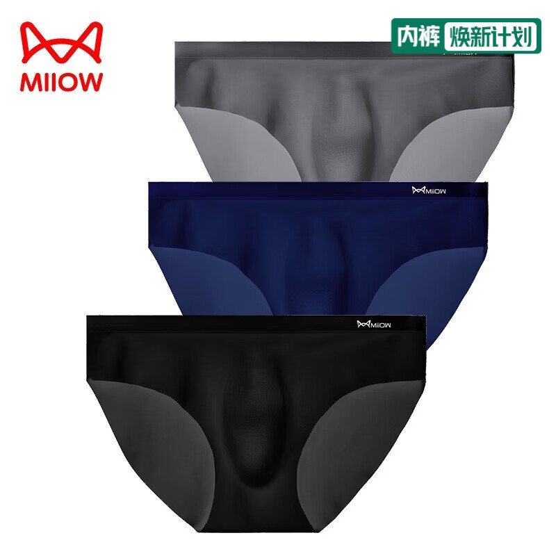 猫人(MiiOW)男士内裤男三角冰丝无痕薄款透气夏季裤衩透明性感底裤头柔软 黑+宝蓝+灰 3条 2XL (130-150斤)