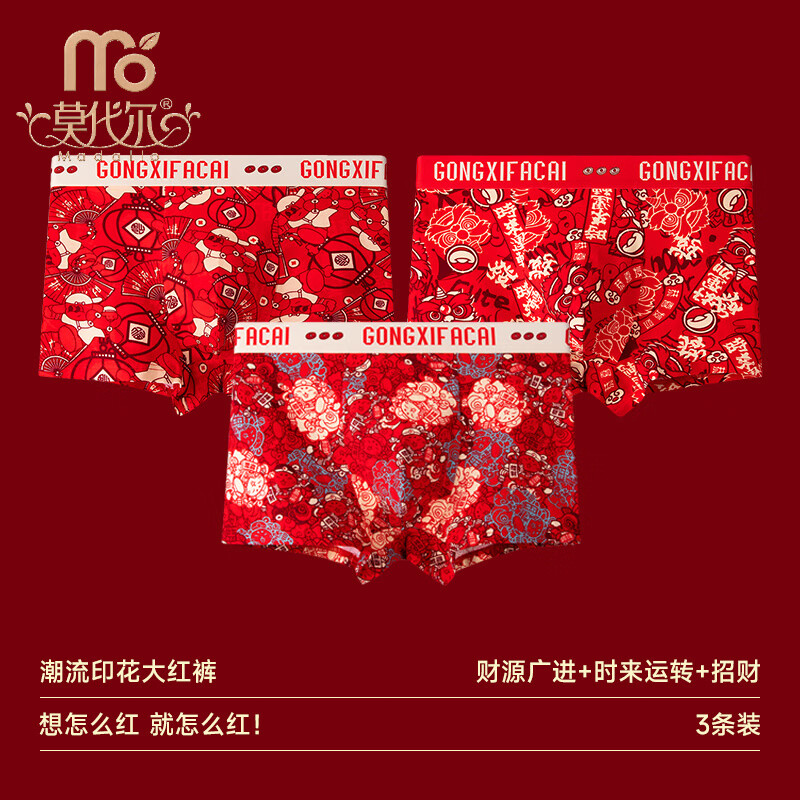 莫代尔属马本命年男士内裤纯棉大红色平角短裤衩宽松四角印花底裤头 时来运转+进宝+财源广进 共 3条 2XL 【建议135-155斤】