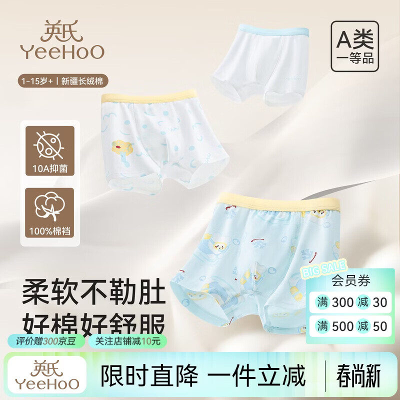 英氏(YEEHOO)2/3条装儿童内裤男女童【10A抑菌防螨】天然低敏95棉宝宝平角裤 可爱小熊 3条 130