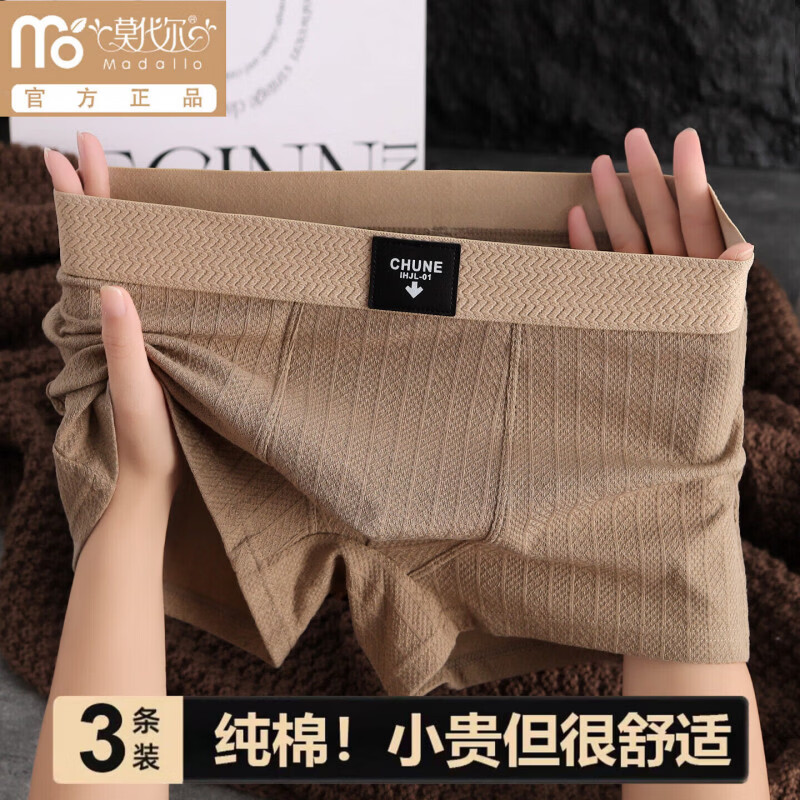 莫代尔纯棉男士内裤男生个性条纹纯色简约舒适透气平角裤潮流四角短裤头 黑色+白色+奶茶(装) 3条 2XL 体重140-160斤