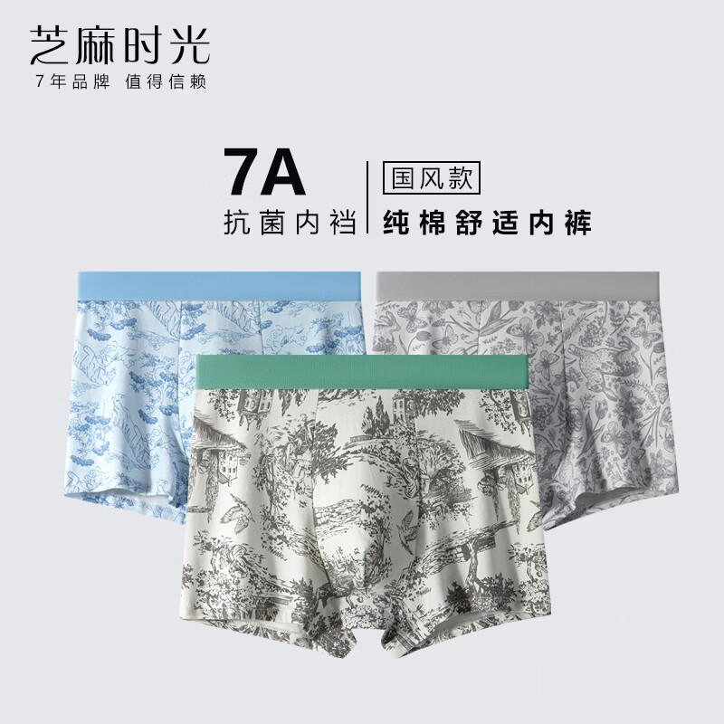 芝麻时光抗菌底档 内裤纯棉男内裤男全棉95%棉短裤衩四角裤正品 纯棉【国风款】【3条装】混色 2XL 建议【120-140斤】