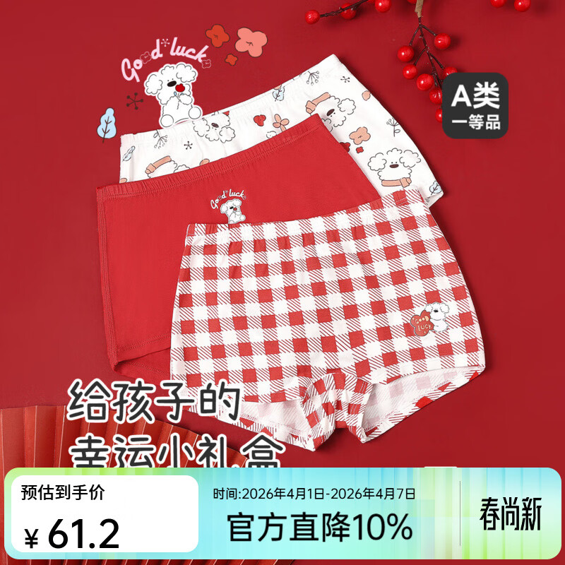 久岁伴少女童【本命年】3条7A抑菌平角内裤优可丝大红礼盒弹力吸湿透气 女生-本命年平角内裤礼盒 3条 2XL (150) 建议身高140-152,体重75-90斤