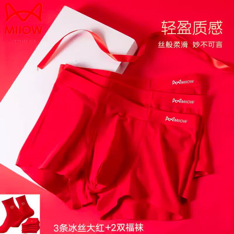 猫人(MiiOW)新款男士红内裤男结婚礼物本命年无痕平角裤冰丝透气大码四角裤头 冰丝大红2双福袜进宝 3条 2XL 适合126-145斤