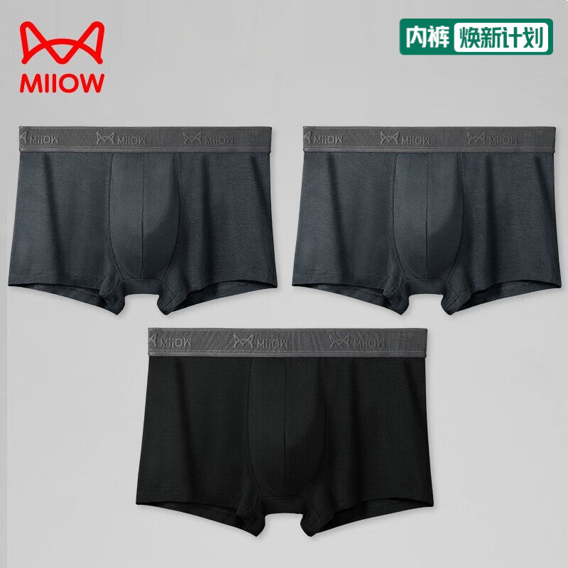 猫人(MiiOW)3条装男士内裤莫代尔男棉质抗菌内档平角裤透气中腰四角裤 灰色x2+黑色 3XL (140-160斤)