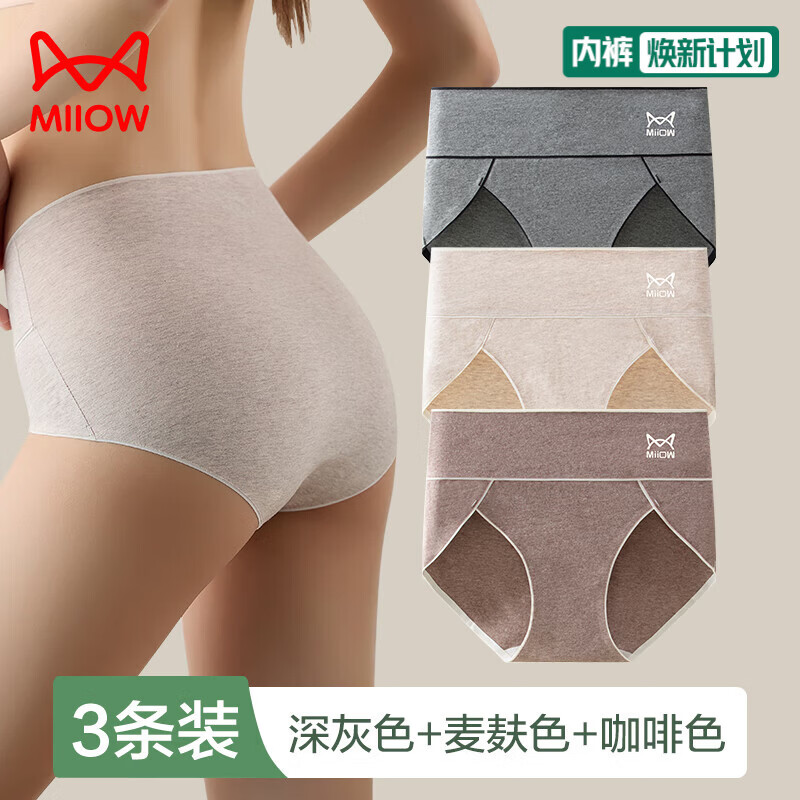 猫人3条装女士内裤高腰彩棉全棉无痕亲肤舒适抑菌裆三角裤内裤女 E-深灰色+麦麸色+咖啡色 2XL (130-155斤)