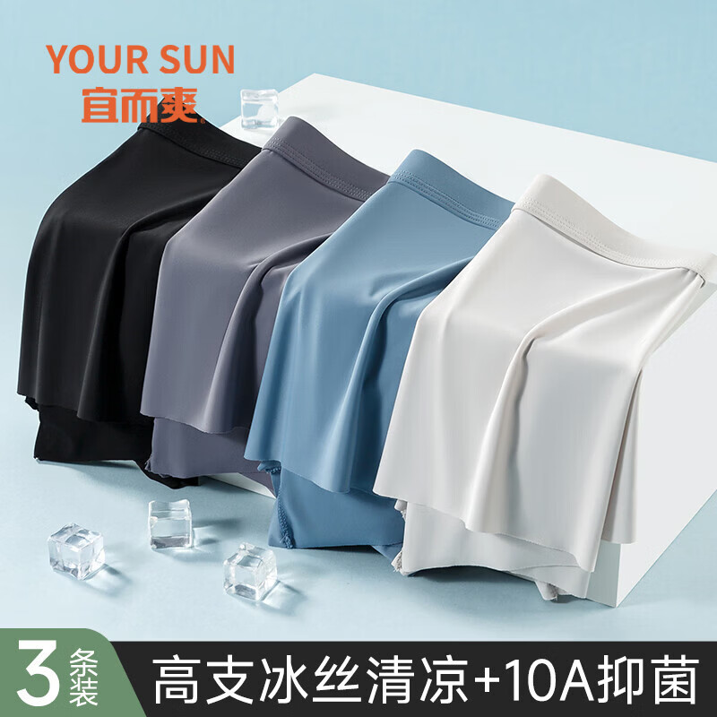 宜而爽男士内裤男10A抑菌高支冰丝凉感舒适轻薄透气高弹无痕平角男裤衩 浅白灰+蔚蓝+浅紫 3条 2XL 建议【130-150斤】