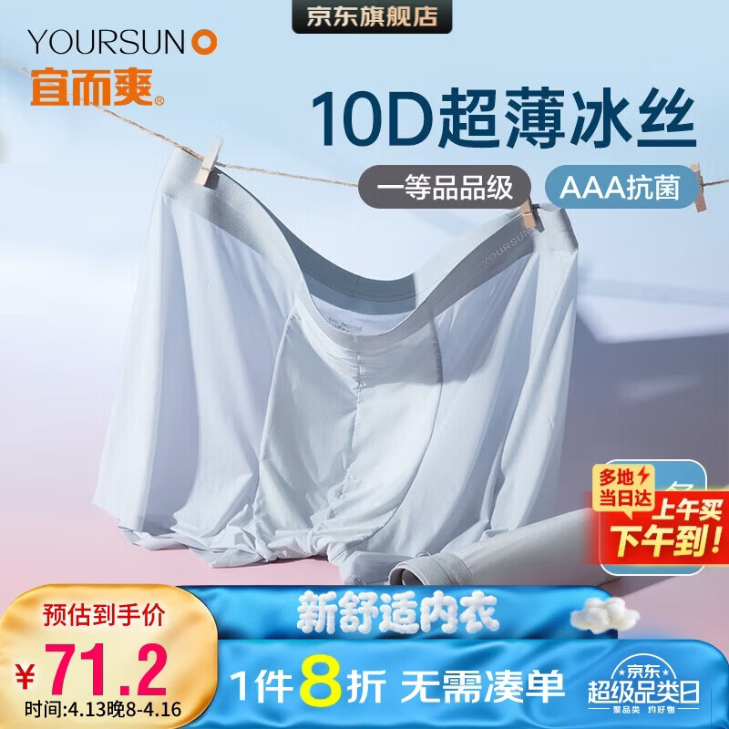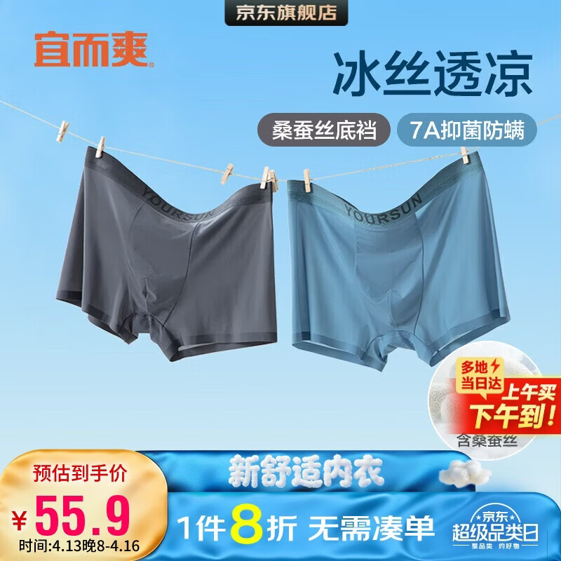 宜而爽【3A抑菌】凉感冰丝男士内裤轻薄透气内衣平角裤男2条装