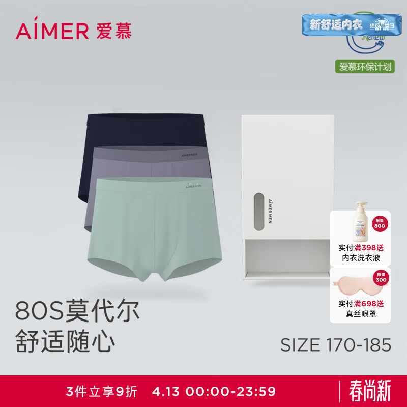 爱慕先生(AIMER MEN)【礼盒3件包】轻薄柔软80s莫代尔全随心抗菌透气内裤男春夏 藏蓝/灰蓝/浪花青 3条 2XL (180)