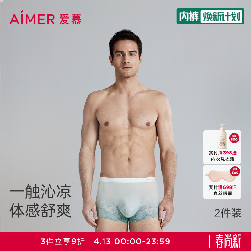 爱慕先生【礼盒2条装】凉感速干内裤男轻薄透气不闷汗冰盒时代冰丝内裤男 湖蓝素色+印花ZS3 2条 L (170)