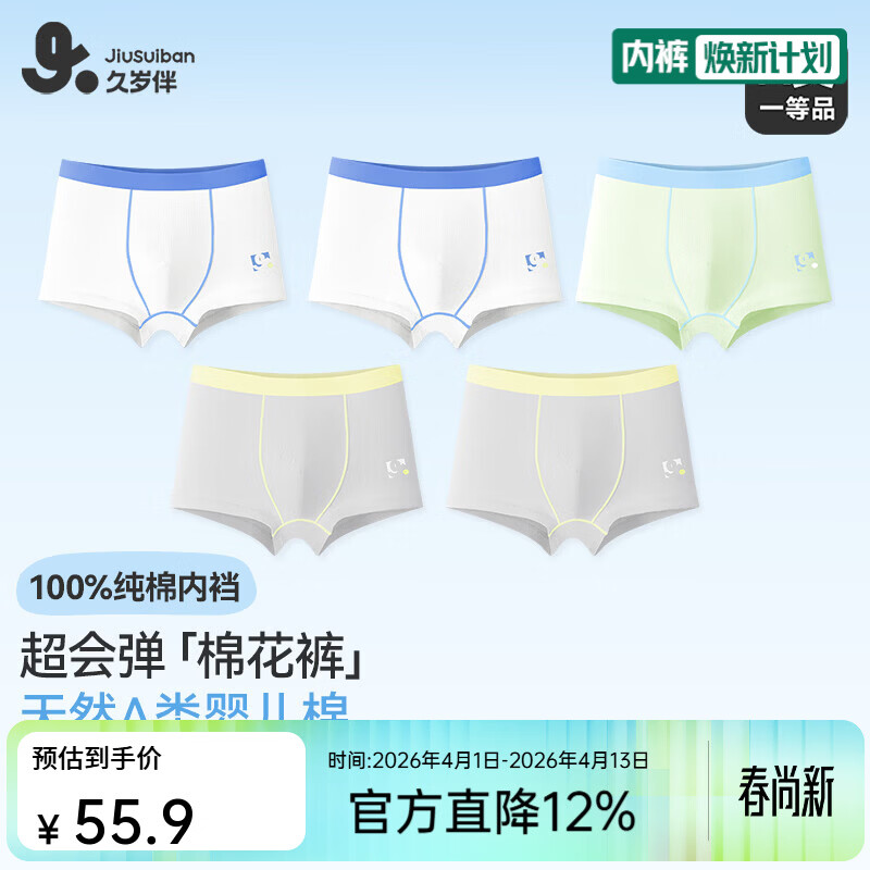 久岁伴男儿童【5条】平角内裤7A抑菌吸湿透气棉青少年本命年红四角裤衩 纯棉内裆(白色2+冰川灰2+青绿1) 5条 3XL (160) 建议身高150-162,体重90-105斤