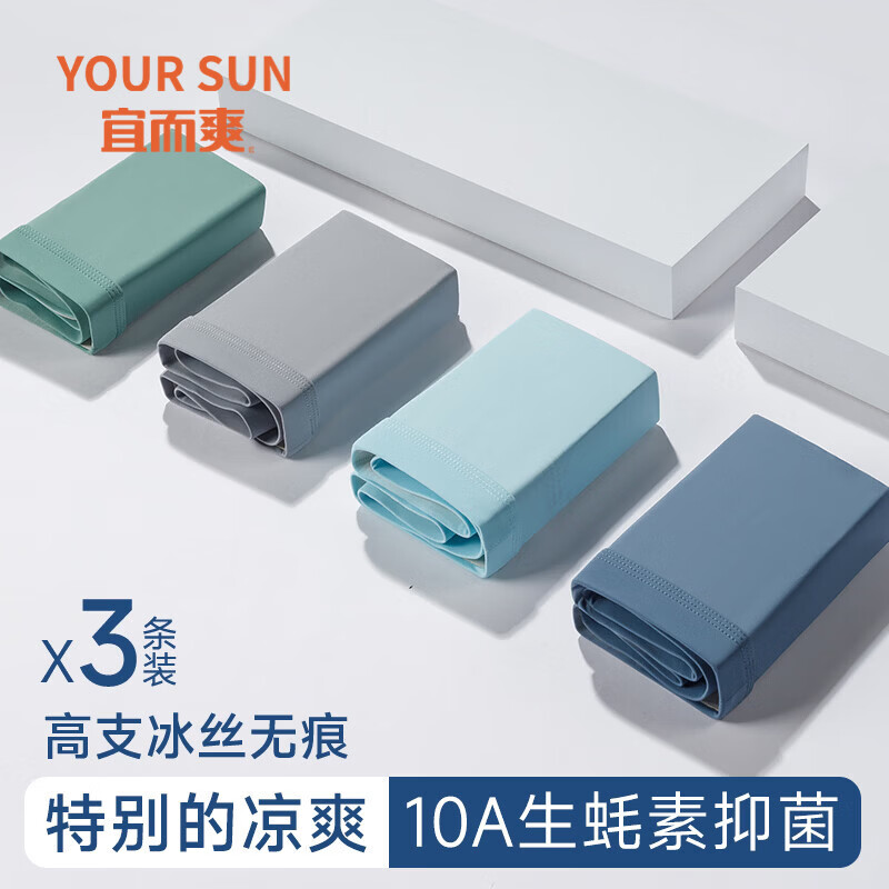 宜而爽【生蚝素】男士内裤10A抑菌高支冰丝凉感无痕高弹中腰平角男裤衩 深灰+浅灰+天蓝 3条 2XL 建议【130-150斤】