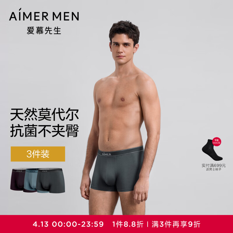 爱慕先生男士内裤【3条装】莫代尔高弹力不勒纯色新内裤三件包男NS23L512 雱霾蓝+紫红色+深灰色ZS2 3条 2XL 180