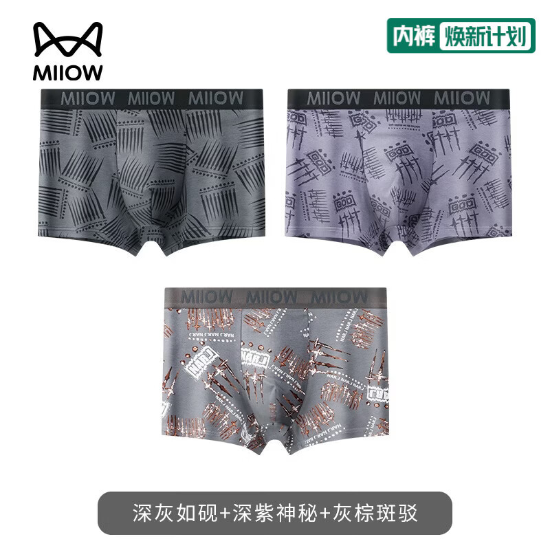 猫人男士内裤纯棉3条复古印花涂鸦四角裤10A级抑菌裆男士透气平角裤头 深灰如砚+深紫神秘+灰棕斑驳 3条 2XL (140-160斤)