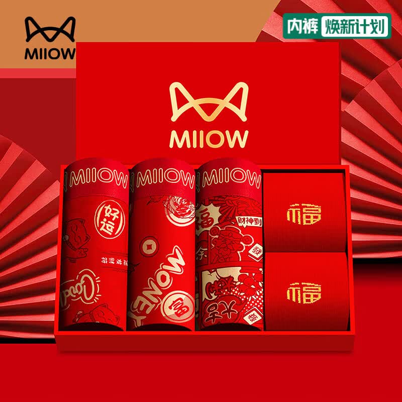 猫人本命年礼物男士内裤大红色男生结婚四角裤大码纯棉底裤平角短裤 好运、暴富、大吉(3裤子+2袜子礼盒装) XL (120-140斤)