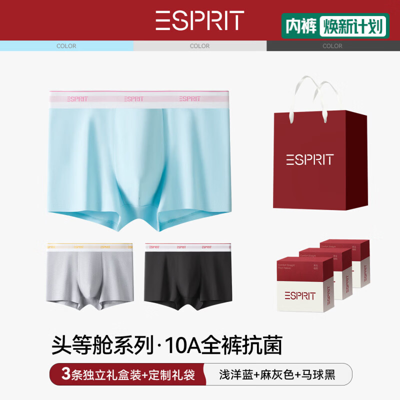 Esprit男士内裤纯棉四角内裤10A抗菌桑蚕丝底裆男生大码运动平角短裤头 浅洋蓝+麻灰色+马球黑 送礼盒+手提礼袋 3条 2XL (180) (150斤-170斤)
