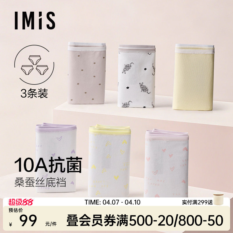 爱美丽3条装10A抗菌棉感印花中腰内裤女士桑蚕丝底裆不夹裆平角裤