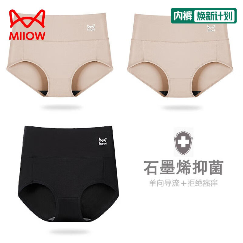 猫人3条装全棉女士内裤高腰收腹提臀三角裤女士短裤头 卡其+卡其+黑色 3条 2XL (135-150斤)