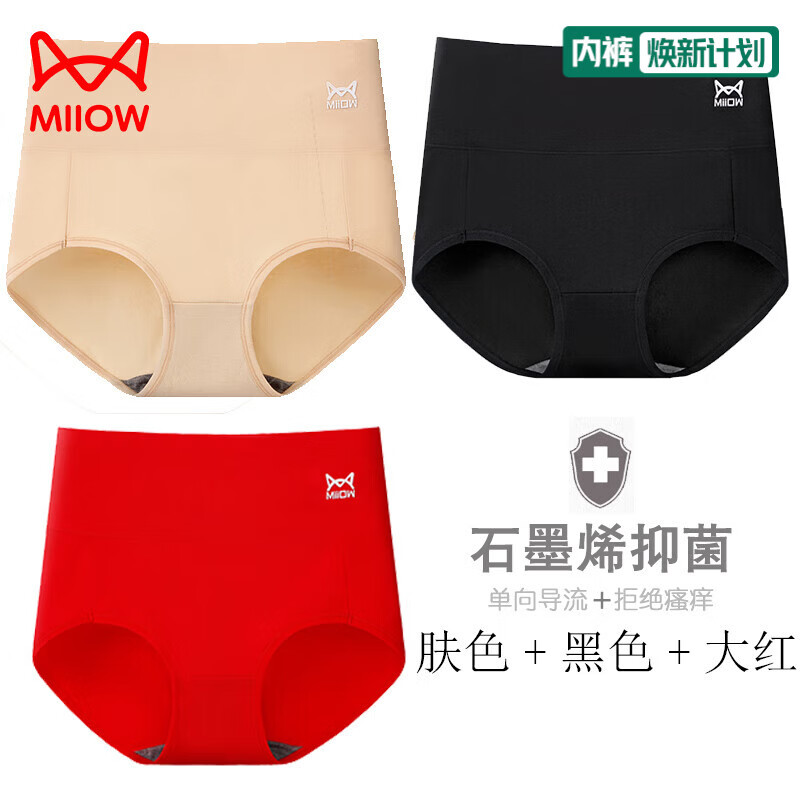 猫人3条装全棉女士内裤高腰收腹提臀三角裤女士短裤头 肤色+黑色+大红色 3条 2XL (135-150斤)