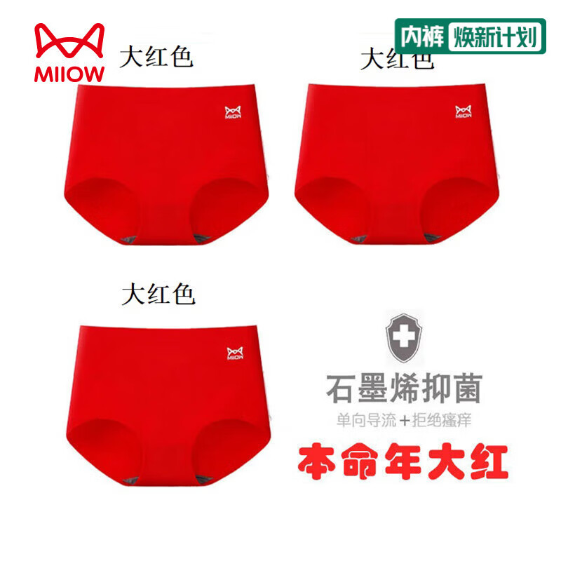 猫人3条装全棉女士内裤高腰收腹提臀三角裤女士短裤头 大红+大红+大红 2XL (135-150斤)