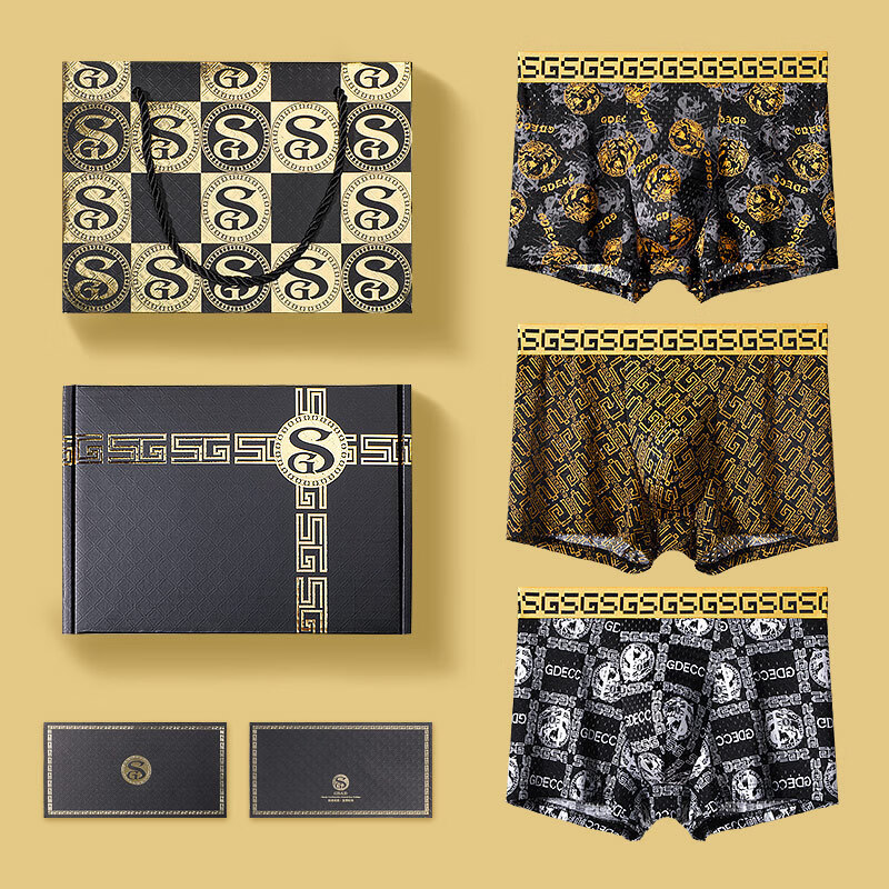 GDAD男士内裤夏季薄款透气冰丝潮印花短裤头裤衩礼盒 S450【453+455+454】装黑金礼盒 3条 2XL (135-155)
