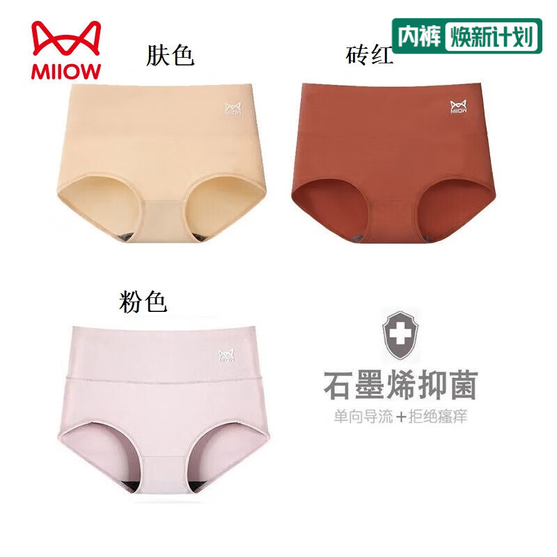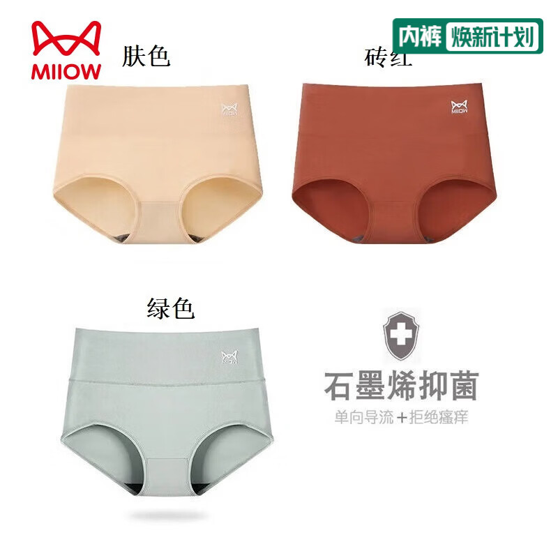 猫人3条装全棉女士内裤高腰收腹提臀三角裤女士短裤头 (203)砖红+肤色+绿 2XL (135-150斤)
