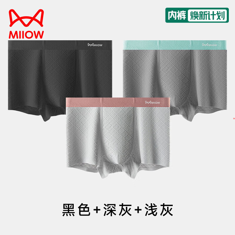 猫人男士内裤纯棉提花男生无痕四角裤头运动透气不卡裆平角短裤衩 黑色+深灰+浅灰 3条 2XL 推荐140-160斤