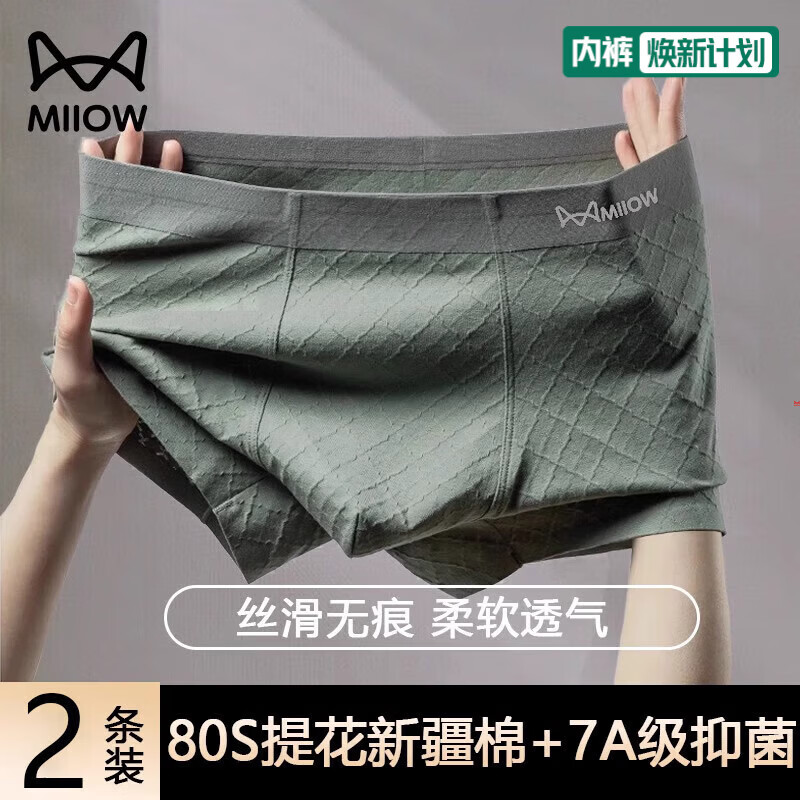 猫人男士内裤纯棉提花男生无痕四角裤头运动透气不卡裆平角短裤衩 暗绿+宝蓝 2条 3XL 推荐160-180斤