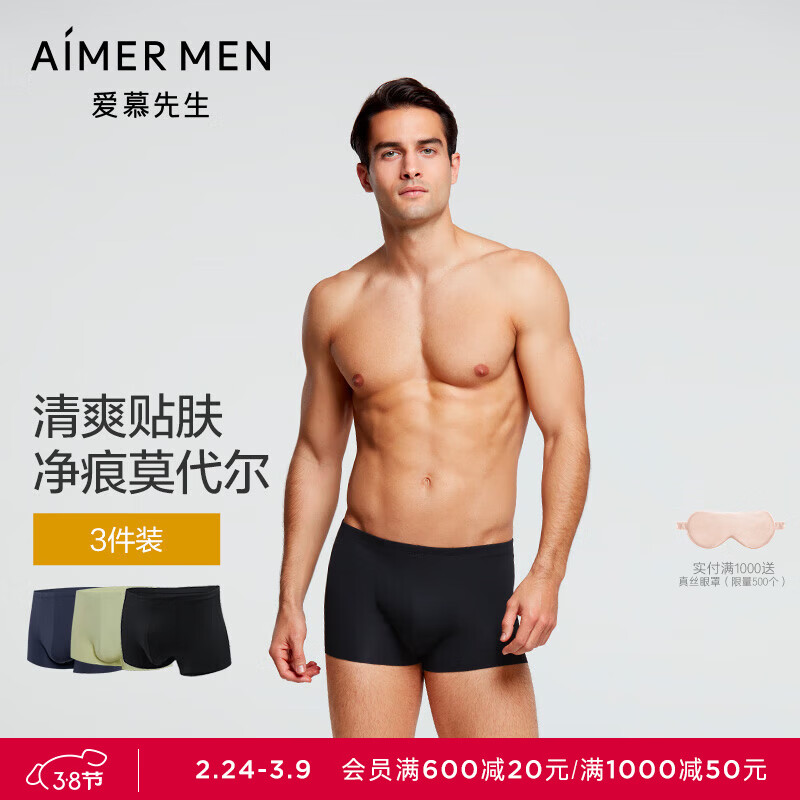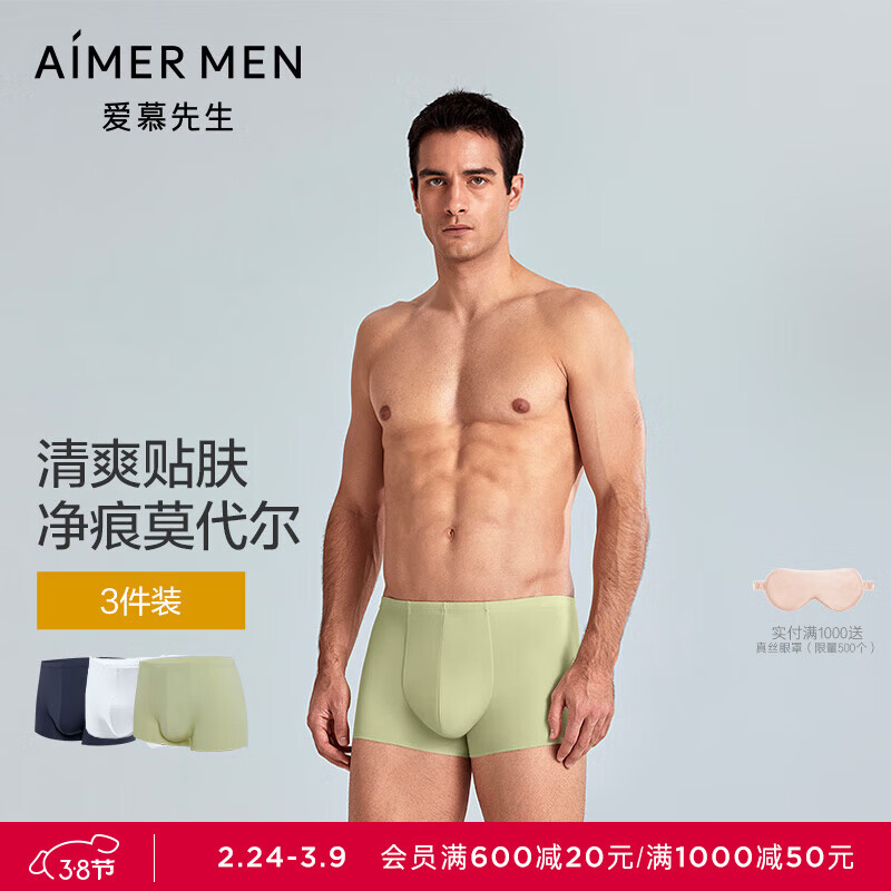 爱慕先生(AIMER MEN)男士内裤100支莫代尔立体剪裁内衣3条装 春辰绿/蝶翅蓝/深夜黑 3条 2XL (180)