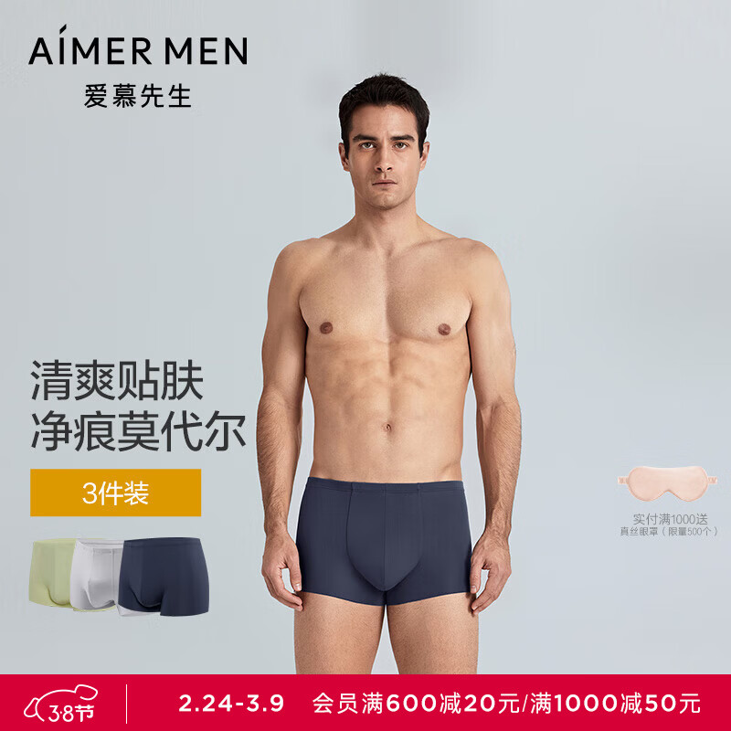 爱慕先生(AIMER MEN)男士内裤100支莫代尔立体剪裁内衣3条装 春辰绿/蝶翅蓝/内敛灰 3条 2XL (180)