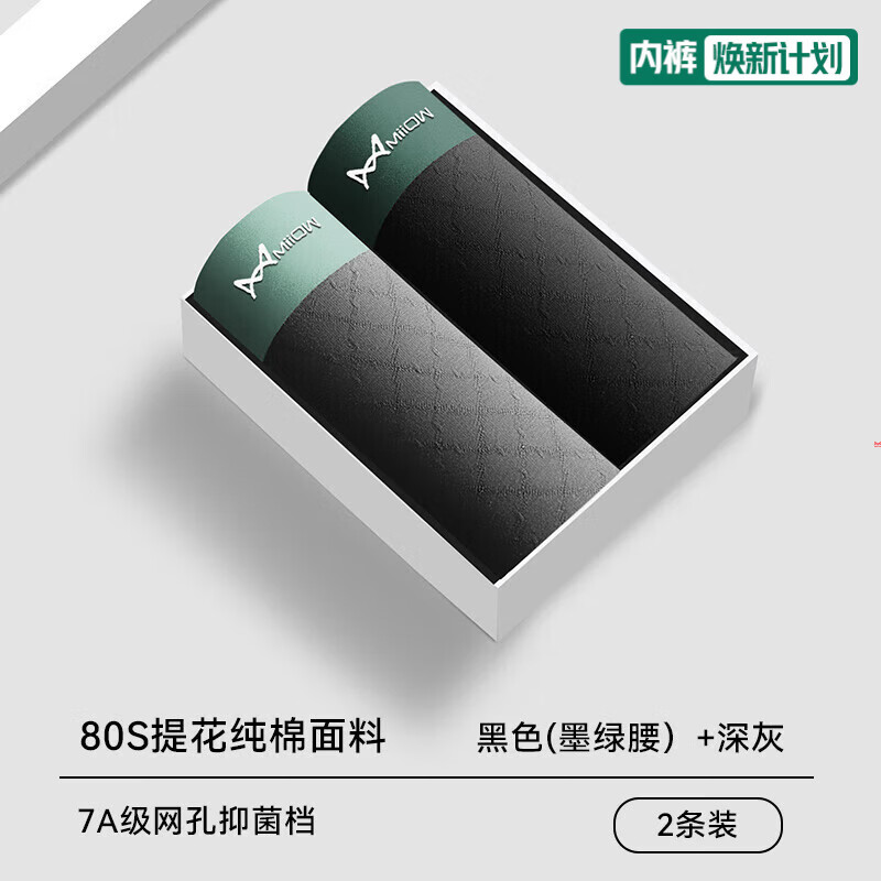猫人男士内裤纯棉提花男生无痕四角裤头运动透气不卡裆平角短裤衩 黑色(墨绿腰)+深灰 2条 3XL 推荐160-180斤