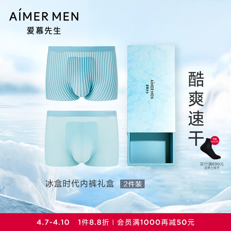 爱慕先生【凉感大空间2件礼盒装】夏季冰丝抗菌透气净痕2件内裤男 冰河绿/冰河绿条纹ZS1 2条 3XL