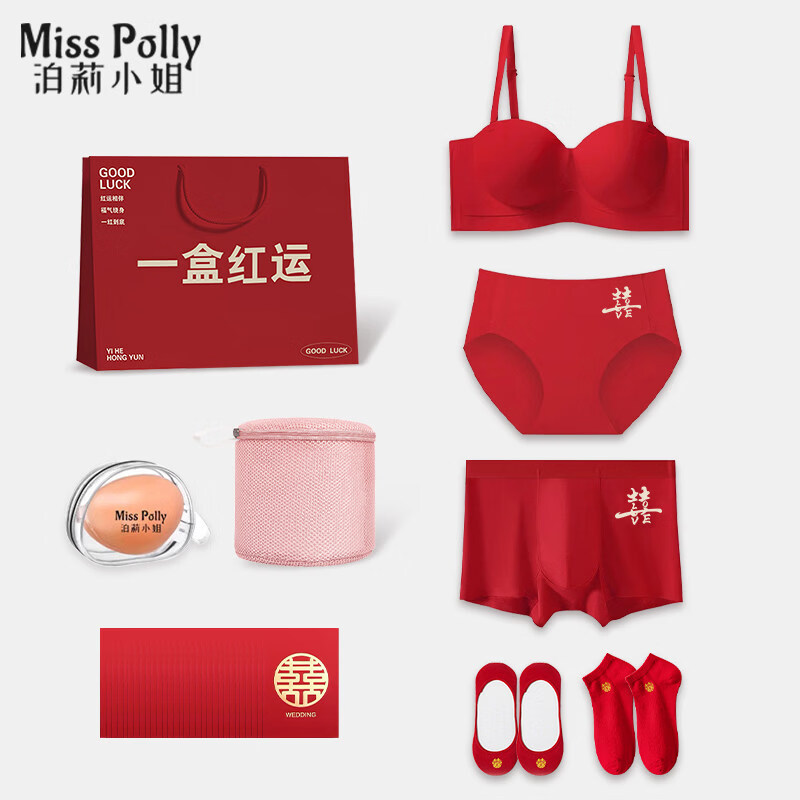 泊莉小姐内衣内裤红色结婚新娘新郎套装情侣小胸聚拢男士女生陪嫁用品礼盒 女内衣套装+男内裤+鎹2双喜袜+洗衣袋+红包(配收 S 男士内裤XL【推荐尺码110-130斤】__(3