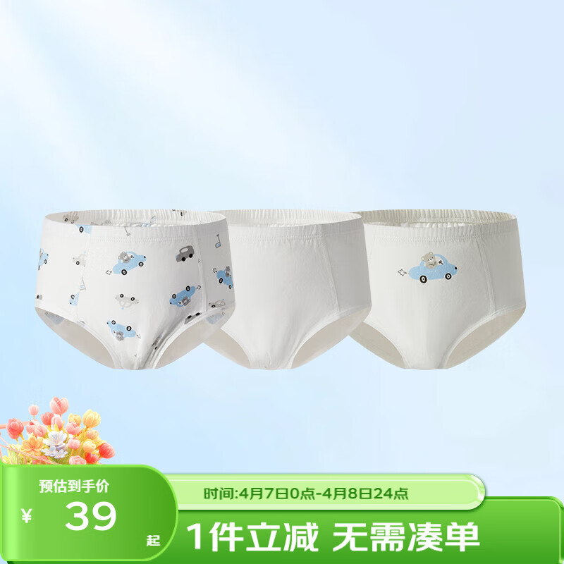 丽婴房(Les enphants)儿童内裤男女童内裤四角不夹PP中大童平角裤三角纯棉纯内裤三条装 【100%棉】小熊与车云-三角男童 【裆底10A抗菌】 3条 90 CM/2岁