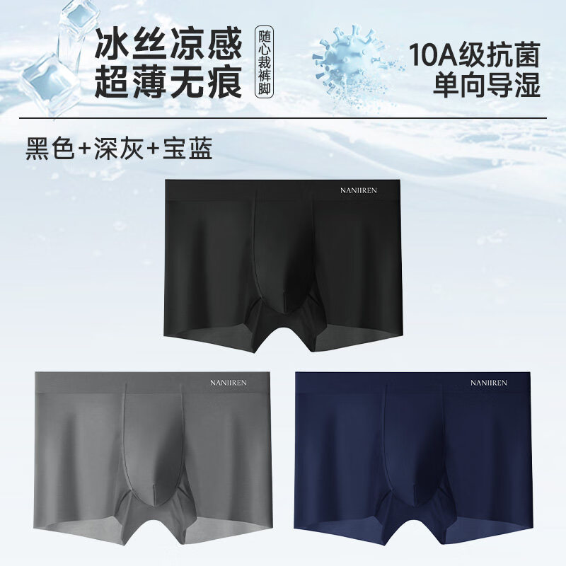 猫人抗菌男士内裤男冰丝无痕四角裤运动宽松男生平角裤衩大码短裤头 【无痕】深蓝/深灰/黑色- 3条 2XL 【建议120-140斤】