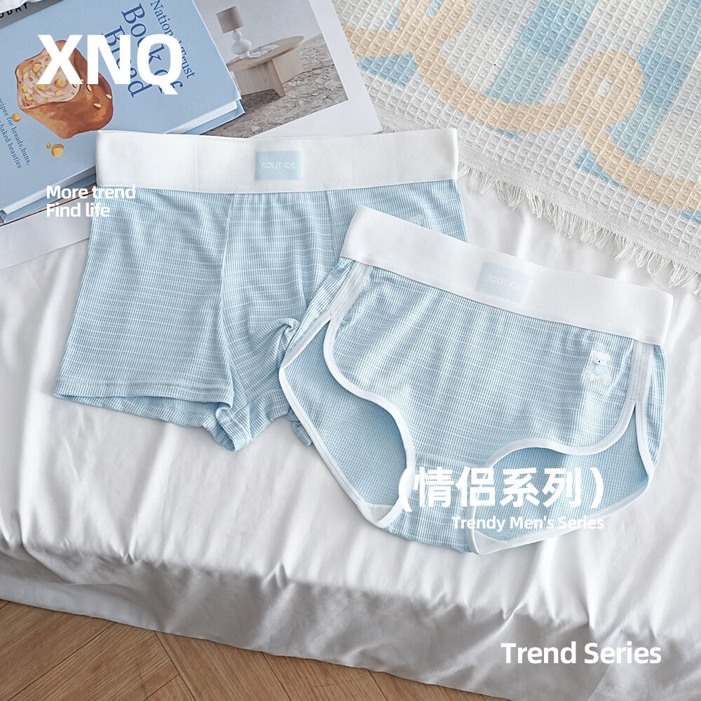 羅亨士情侣内裤一男一女可爱卡通小熊条纹透气短裤衩男女夫妻同款短裤头 蓝条纹小熊情侣款 2条 3XL 男+女XL码