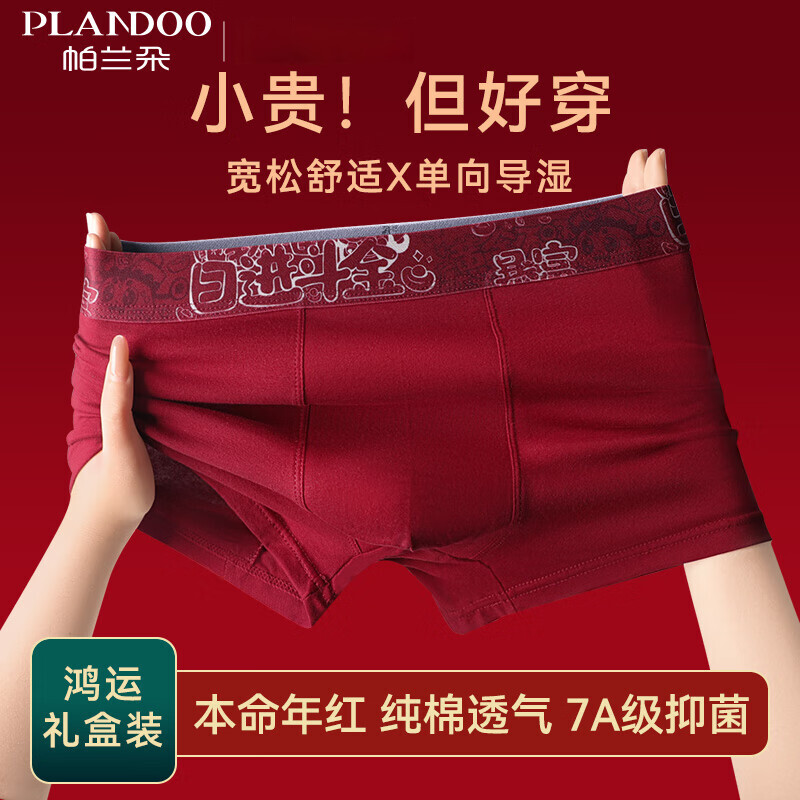帕兰朵(PLANDOO)男士内裤男棉本命年短裤男款红色平角裤结婚四角裤大红袜 紫气东来+日进斗金+多财多亿+袜子*2_【内裤 3条 L _【:90-110斤】