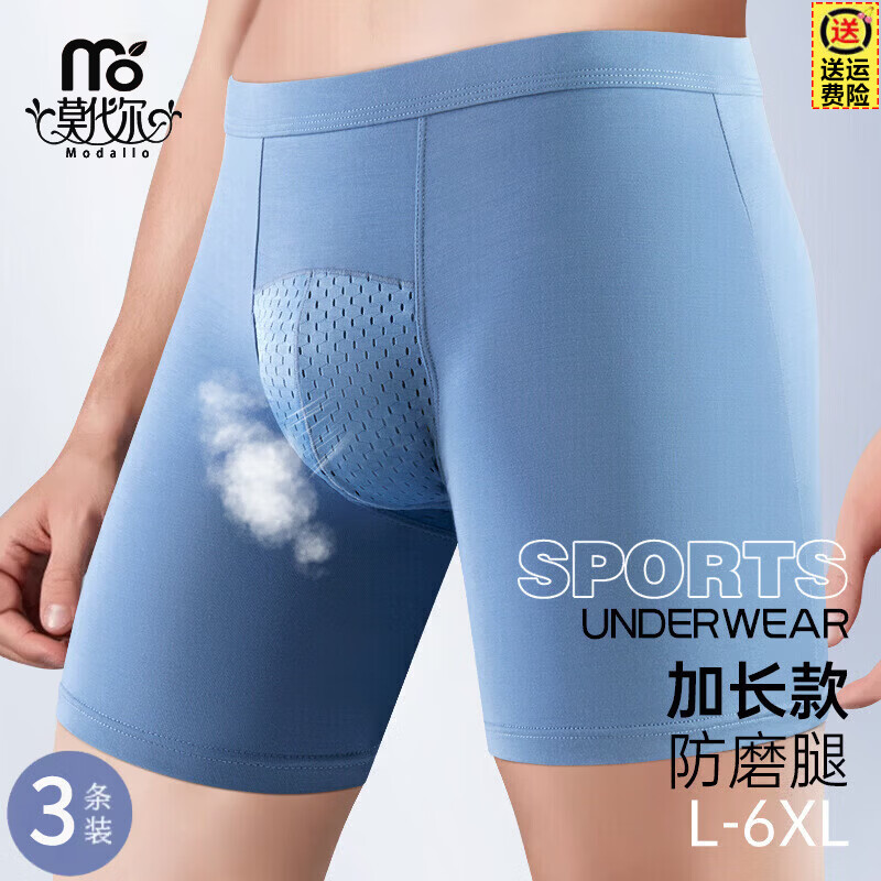 莫代尔防磨腿内裤男士莫代尔夏季薄款大码运动跑步加长款防磨裆平角裤 黑色+浅灰蓝+蓝绿 3条 2XL (建议140-160斤)