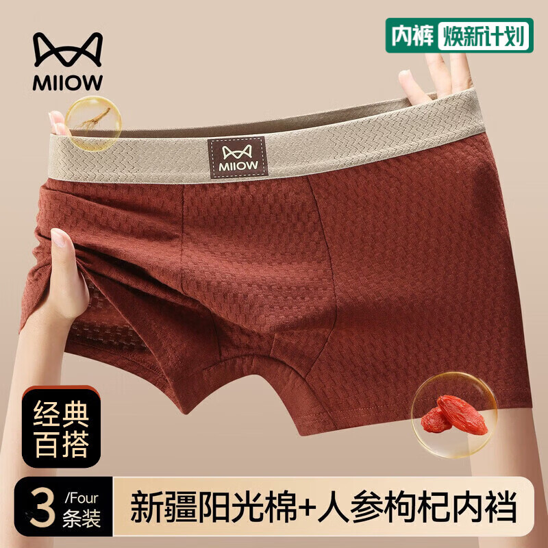 猫人(MiiOW)男士内裤纯棉裆男生2026新款平角裤男式大码透气四角短裤头男款 焦糖棕+木绿色+墨绿色 共 3条 2XL 建议:120-140斤