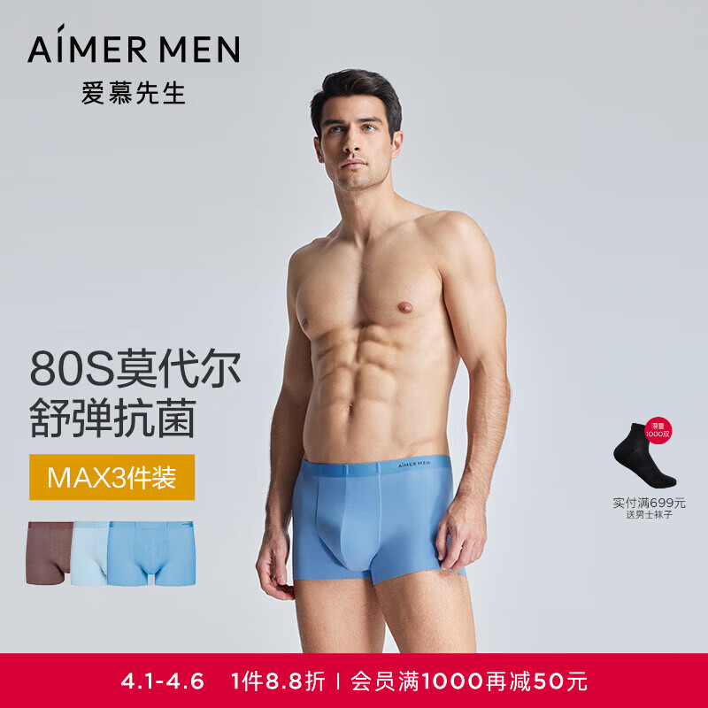 爱慕先生【3条装】内裤男80s莫代尔轻薄透气抗菌柔感全随心男士平角裤内裤 巧克力/晴空蓝/浪花青 3条 2XL (180)