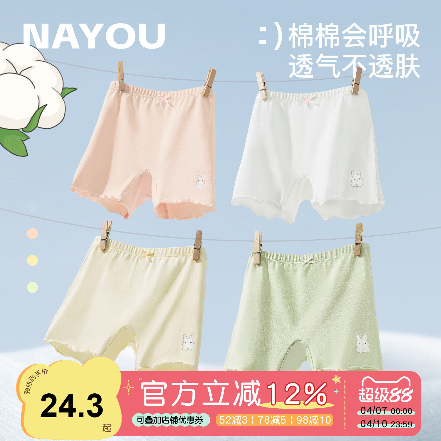 纳柚儿童安全裤纯棉女童内裤四角打底裤莫代尔防走光保险裤三合一