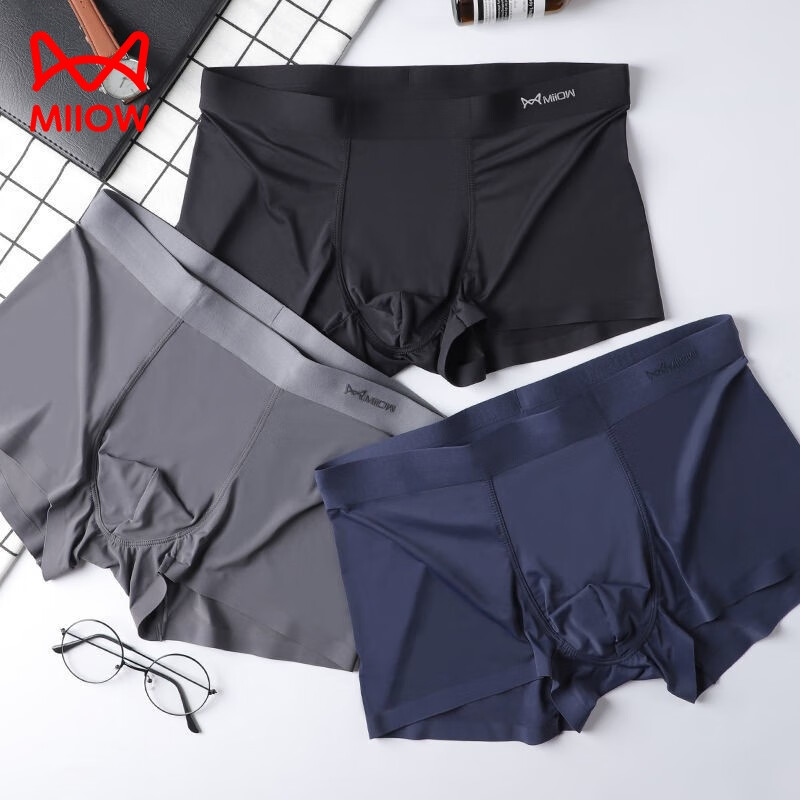 猫人抗菌男士内裤男冰丝无痕四角裤运动宽松男生平角裤衩大码短裤头 【无痕】深蓝/深灰/黑色- 3条 2XL 【建议120-140斤】