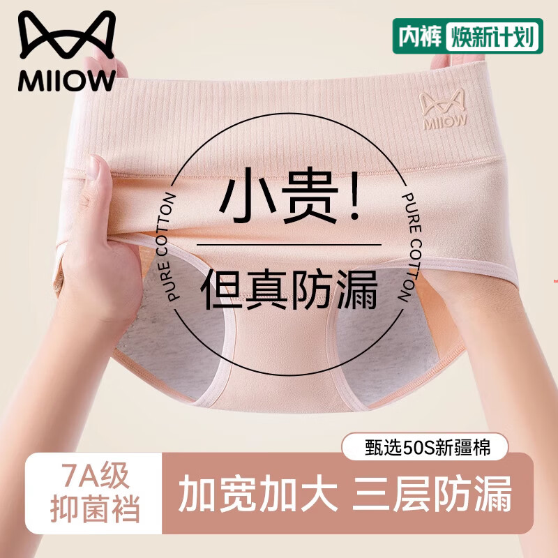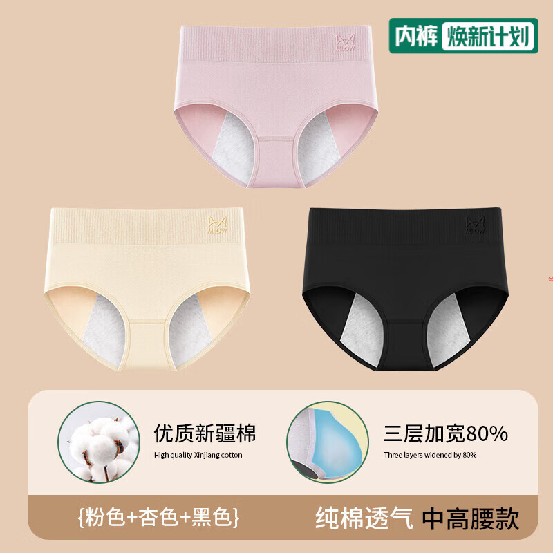 猫人生理期内裤女士纯棉抗菌裆大姨妈月经期加宽防漏女生三角短裤头 粉色+杏色+黑色 3条 2XL 【建议140-160斤】