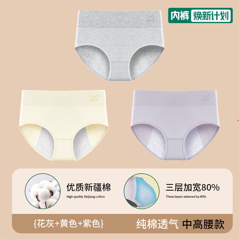 猫人生理期内裤女士纯棉抗菌裆大姨妈月经期加宽防漏女生三角短裤头 花灰+黄色+紫色 3条 2XL 【建议140-160斤】