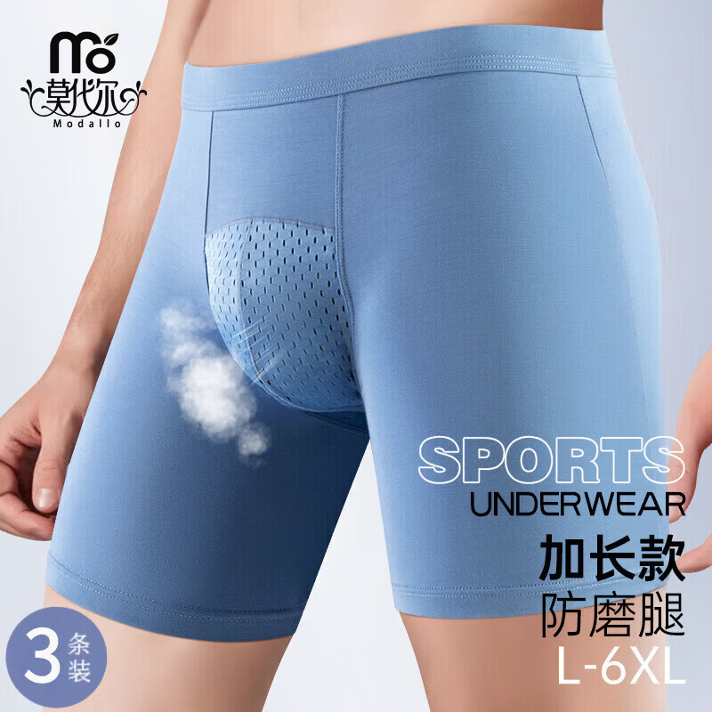 莫代尔防磨腿内裤男士莫代尔夏季薄款大码运动跑步加长款防磨裆平角裤 黑色+浅灰蓝+蓝绿 3条 2XL (建议140-160斤)