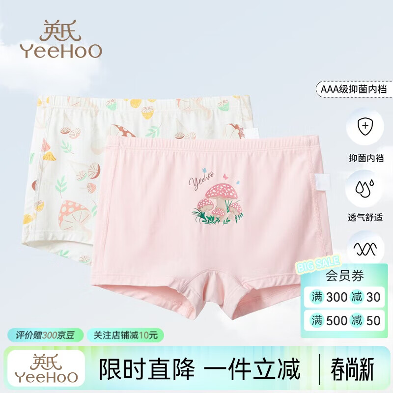英氏(YEEHOO)2条装儿童内裤女童3A艾草抑菌A类透气内裤中大童抗菌平角三角短裤 缤纷蘑菇 【两条装】 2条 140