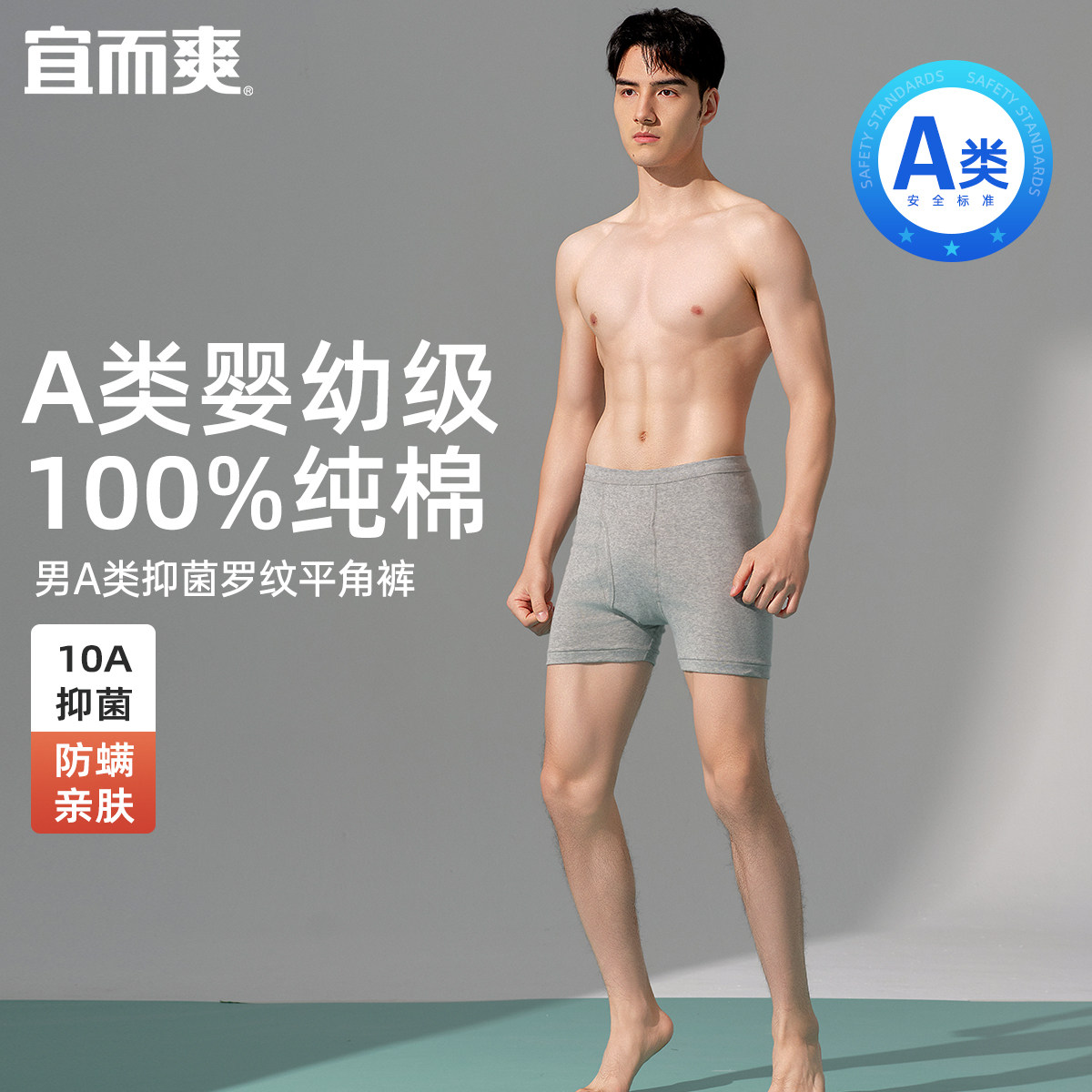 宜而爽男士罗纹内裤纯棉10A抑菌短裤A类婴儿棉中腰平角裤大码男